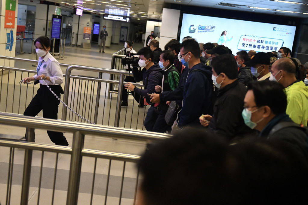港鐵東鐵線首班開往羅湖站的列車于早上5時(shí)35分由沙田開出,不少市民上車,列車抵達(dá)上水站時(shí)更多乘客登車,約5分鐘終于到達(dá)羅湖站,市民魚貫落車,港鐵職員向市民派發(fā)口罩及酒精搓手液等紀(jì)念品,至早上6時(shí)30分,入境處職員拉起鐵閘,市民前去辦理離境手續(xù),正式踏入暌別三年的深圳。