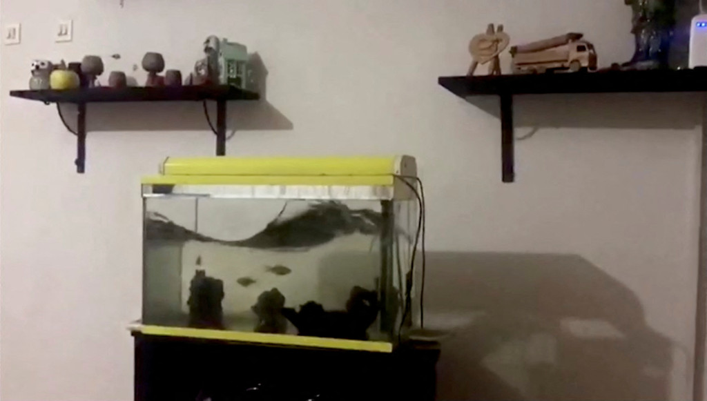 ▲土耳其迪亞巴克爾發(fā)生地震時,一處民宅的魚缸中的水,在影片中不停搖晃。路透社