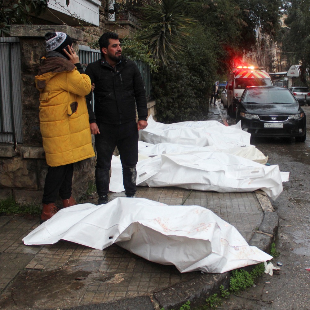 ▲敘利亞阿勒頗發(fā)生地震后,人們站在裝在地上的袋子里的尸體旁邊。路透社