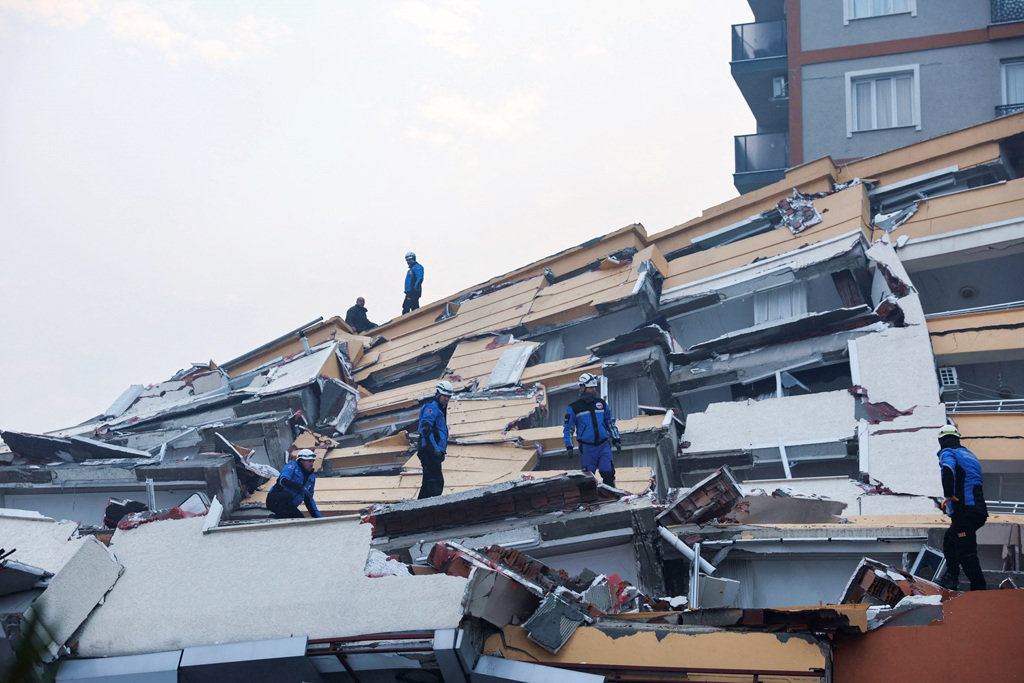 ▲土耳其6日發(fā)生規(guī)模7.8大地震,造成數(shù)千棟建筑倒塌。 圖為震央地帶哈泰(Hatay)省的大樓如松餅般堆疊。路透社