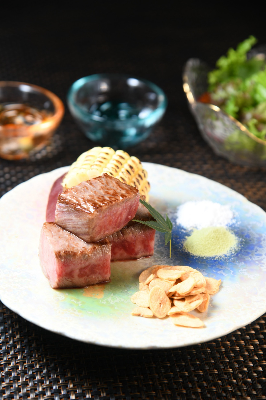 ▲和牛燒(廚師發(fā)辦) 將鹿兒島和牛肉眼部位去掉多余脂肪,放在鐵板上燒至半生熟,伴抹茶鹽及海鹽吃,滋味可口。