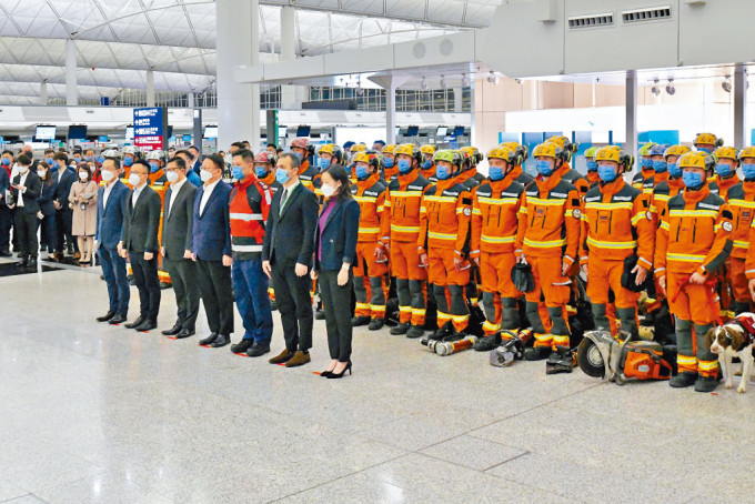 ▲香港消防處派出多名坍塌搜救專隊(duì)及救護(hù)員到土耳其,陳國基、鄧炳強(qiáng)及土耳其領(lǐng)事館代表到機(jī)場送行。