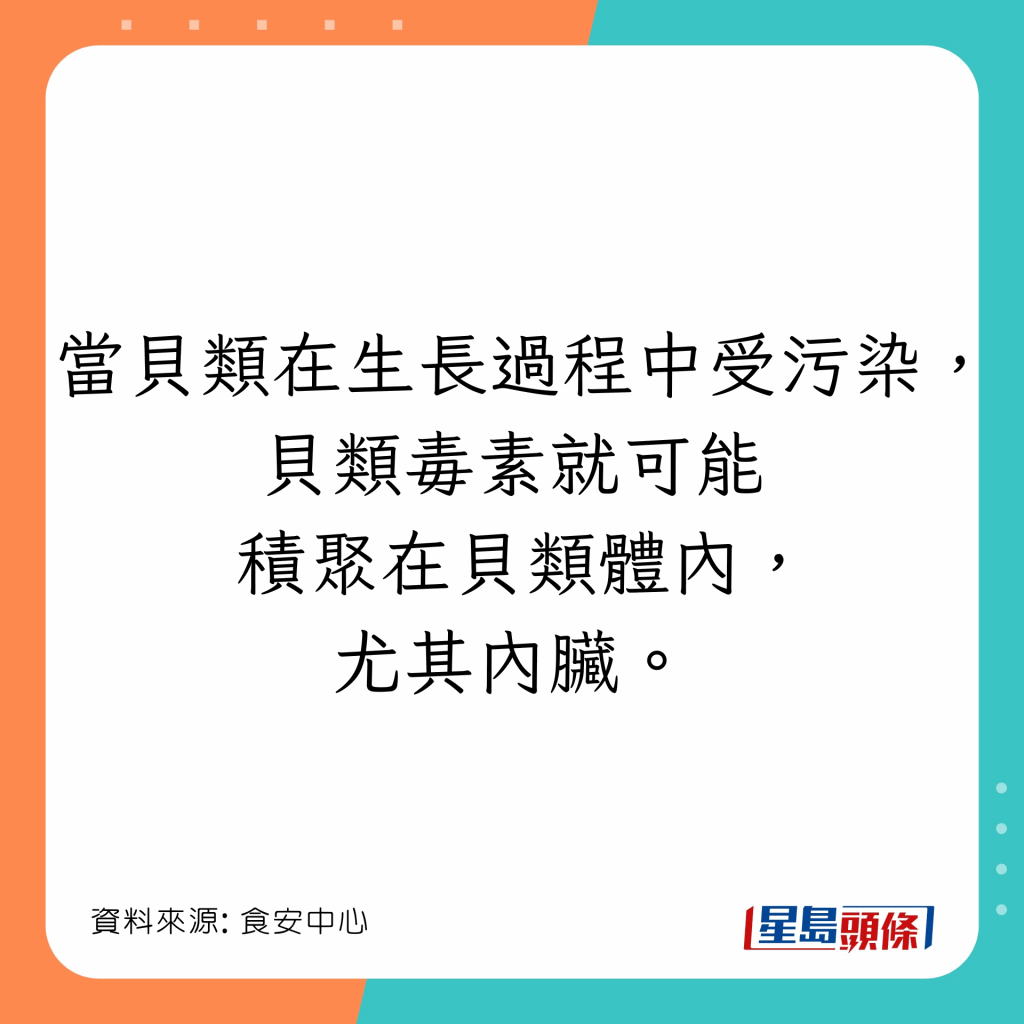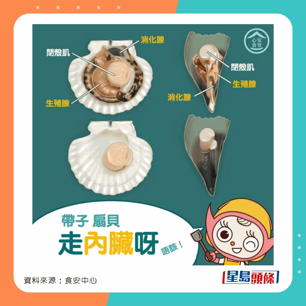 食安中心指,貝類海產(chǎn)3個部位易含毒素,食用時要避免,以減低食物中毒風險。食安列出高危部位,并解釋原因: