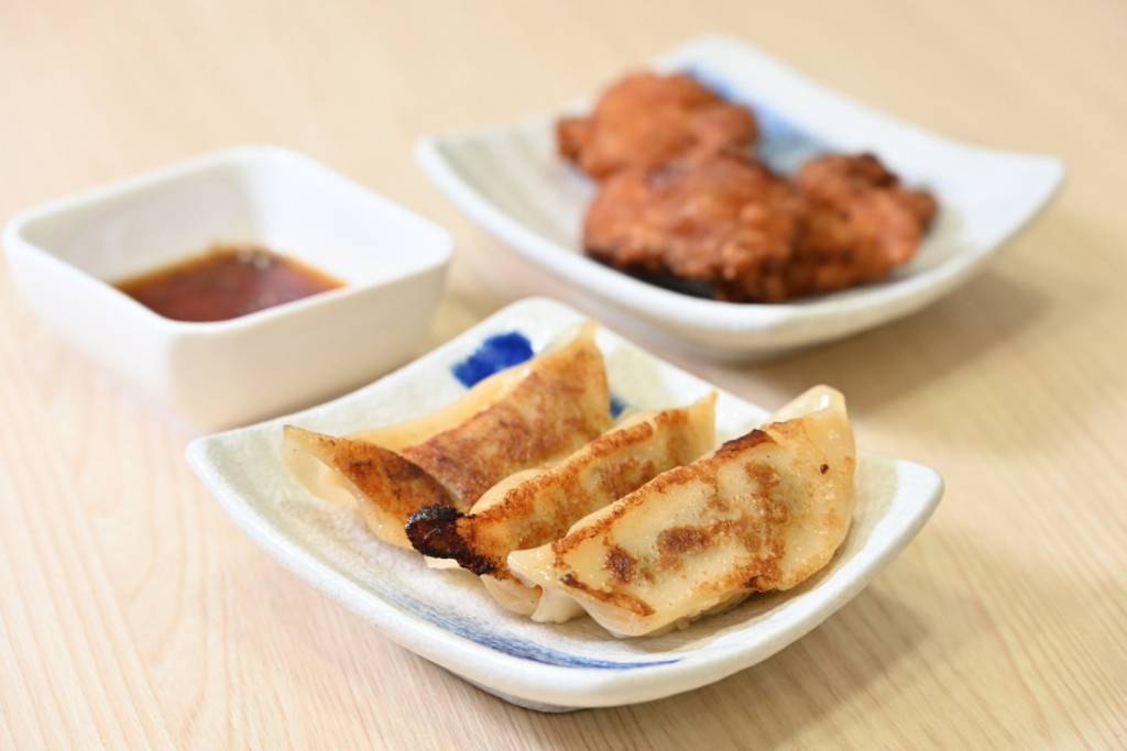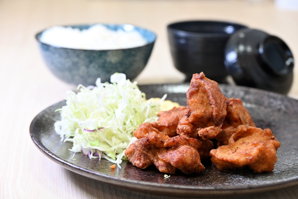 唐揚(yáng)炸雞定食,將無骨雞塊沾上自家調(diào)制的炸漿,放進(jìn)滾油中炸至香脆,佐以白飯和椰菜絲同吃,酥脆不膩。
