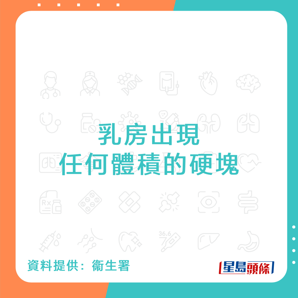 據(jù)2020最新統(tǒng)計(jì),乳癌為香港第3號(hào)癌癥殺手。綜合衛(wèi)生署及政府癌癥網(wǎng)上資源中心資料,當(dāng)乳腺細(xì)胞失控分裂和生長(zhǎng),就會(huì)形成腫瘤,腫瘤分為良性及惡性,乳房?jī)?nèi)的惡性腫瘤就是乳癌。若出現(xiàn)6大癥狀,有可能患上乳癌: