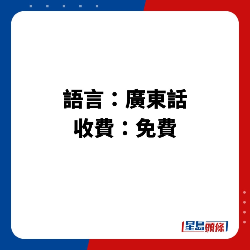 時間:星期二11:30am - 12:30pm、02:30am - 03:30pm;星期六11:30am - 12:30pm、02:30am - 03:30pm