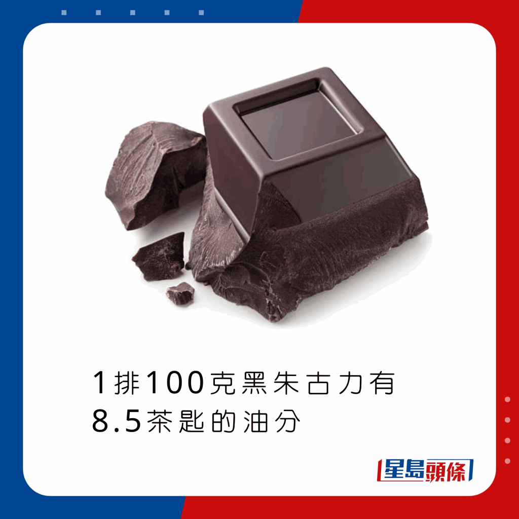 1排重100克的黑朱古力已有598千卡熱量,相等于2.5碗白飯的熱量,當(dāng)中有8.5茶匙的油分,每天進食1排朱古力的話6天就會增加1磅體脂了,體重及體脂增會亦會增加患上各種慢食疾病的風(fēng)險。
