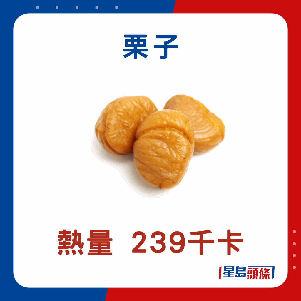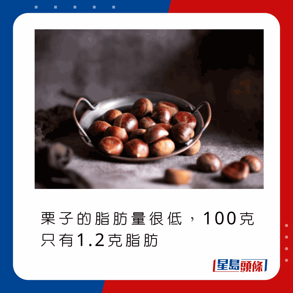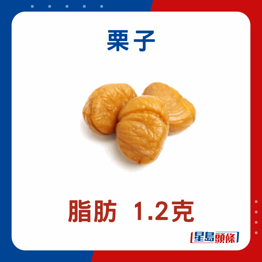 栗子的脂肪卻低得多,只有1.2克,卻有豐富的碳水化合物,能補充身體能量。