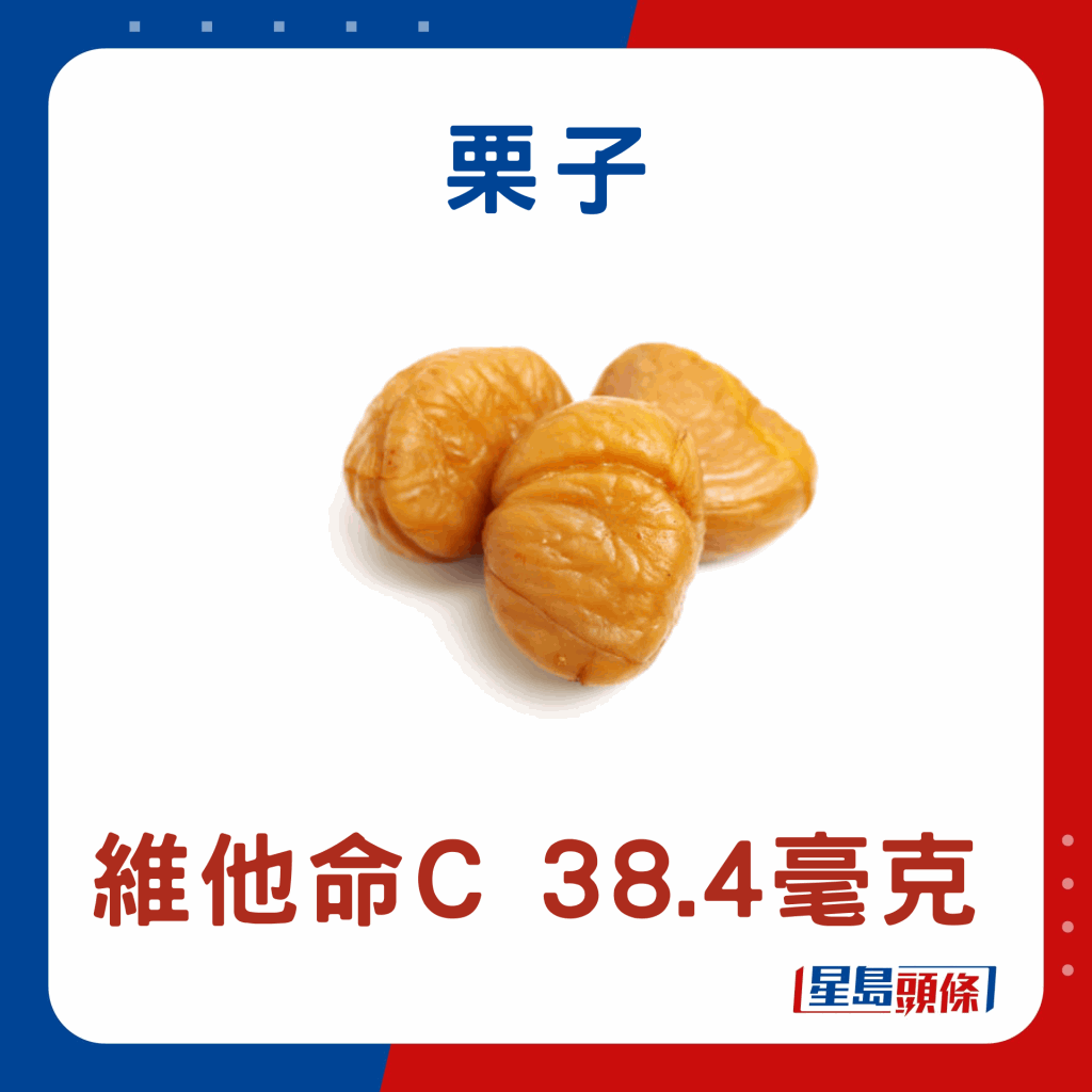 5粒約40克的栗子已有15毫克維他命C,是成年女士每天需要的1/5分量。