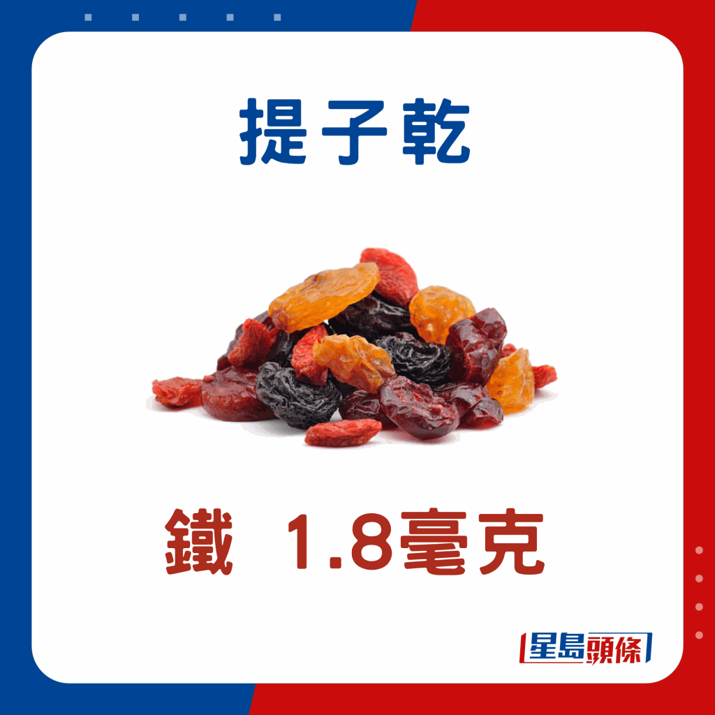 提子干含鐵質(zhì),不過屬植物性的非血紅素鐵,研究指其吸收率有1至10%,比動物性的血紅素鐵的(25%至30%)低