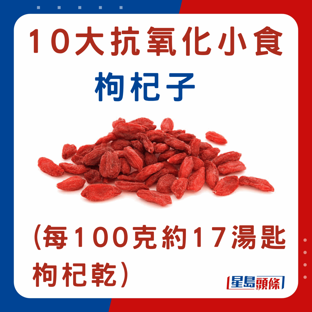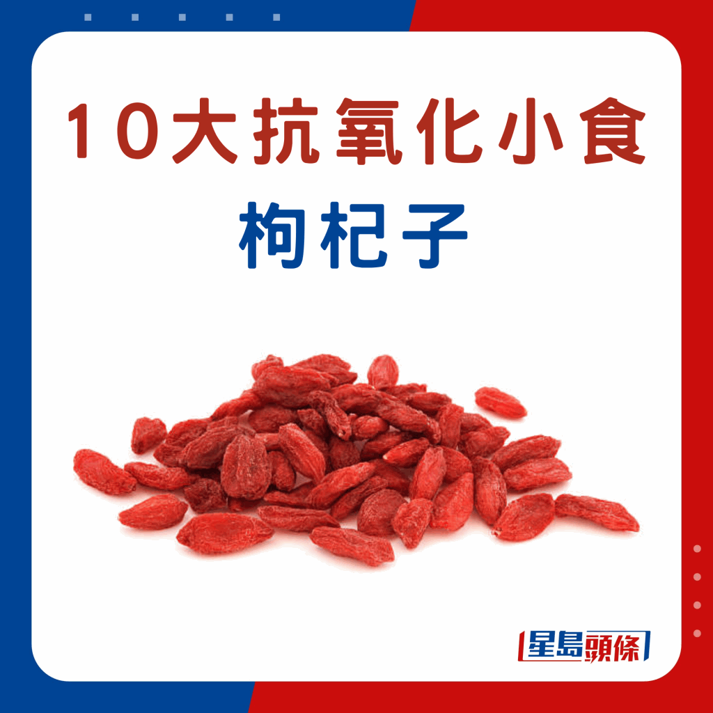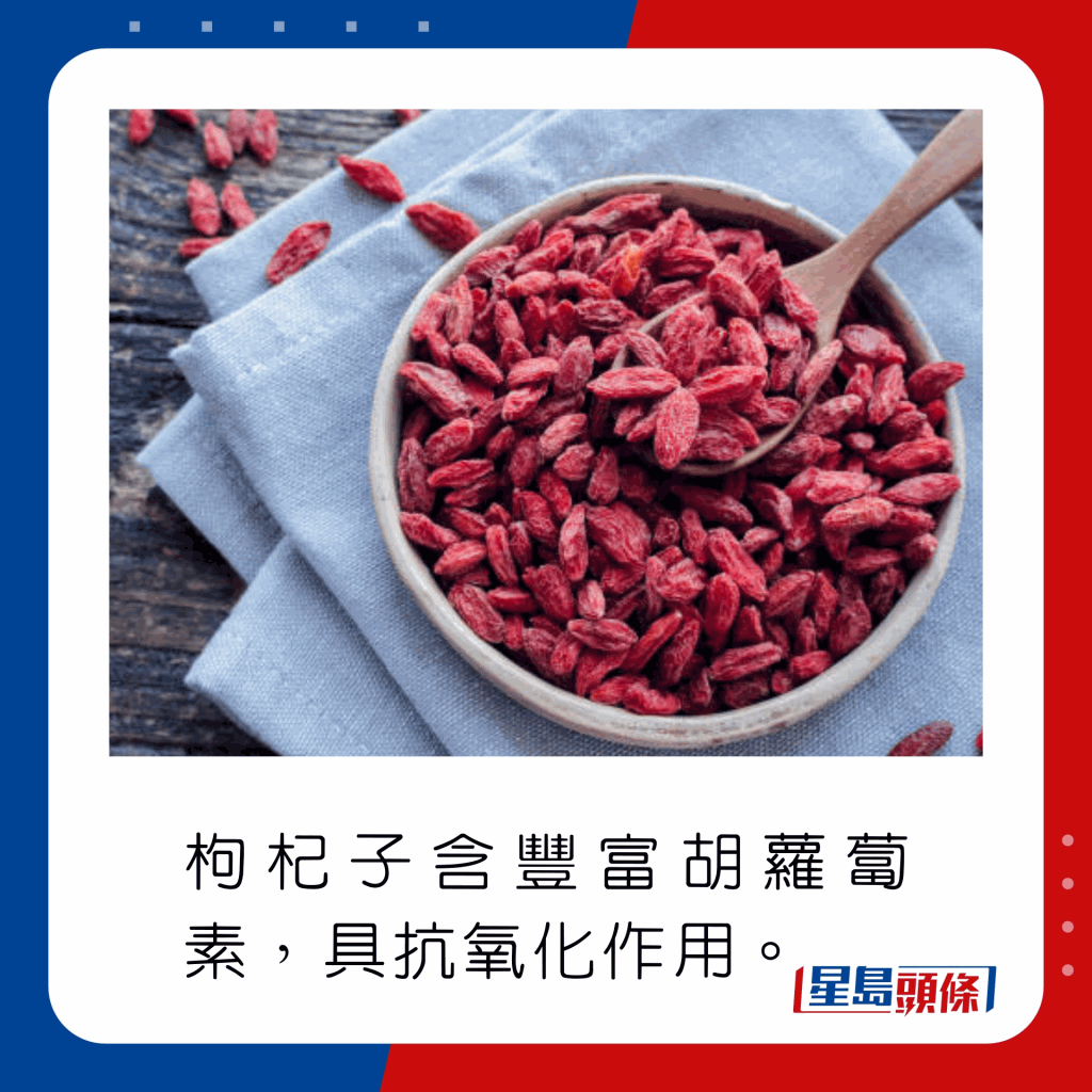 枸杞子含豐富胡蘿卜素、酚類化合物、類黃酮,具抗氧化抗衰老及防癌的作用。