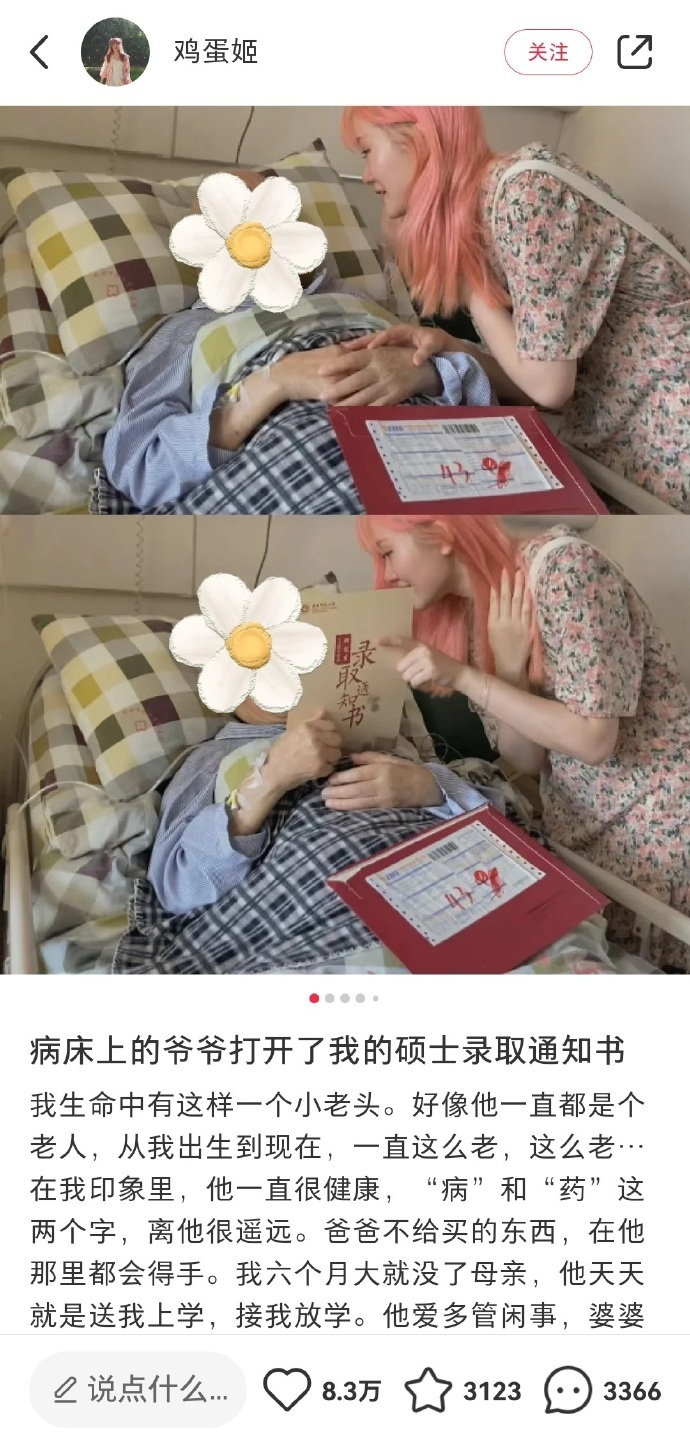 據(jù)極目新聞此前報(bào)道,鄭某華出生于1999年。 2022年7月,在被保研到華東師范大學(xué)后,她第一時(shí)間拿著錄取通知書到醫(yī)院,與病床上84歲的爺爺分享這一喜事。 對(duì)她來(lái)說(shuō),爺爺是世上最愛(ài)她的人,成為爺爺?shù)尿湴烈彩撬佳械膭?dòng)力之一。 她連信封都沒(méi)舍得拆。 她拍下了照片和視頻發(fā)到社交平臺(tái)留作紀(jì)念。 說(shuō)到染粉色頭發(fā)的初衷,她說(shuō)希望畢業(yè)照上的自己能是明媚而鮮艷的。