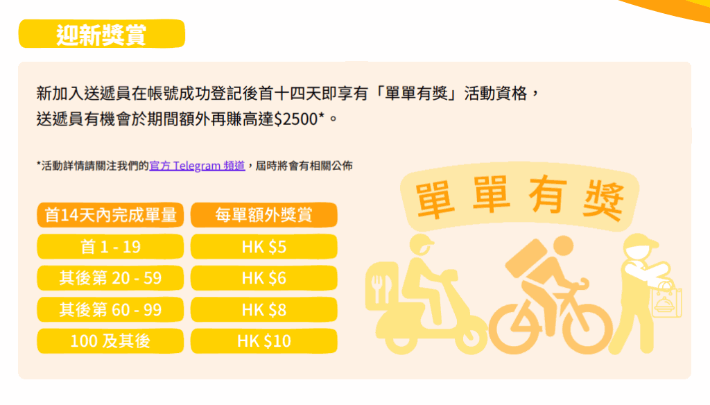 美團(tuán)為吸引外賣員加入,亦設(shè)有迎新獎(jiǎng)賞,14天內(nèi)完成目標(biāo)單量,便即可獲額外高達(dá)2500元。
