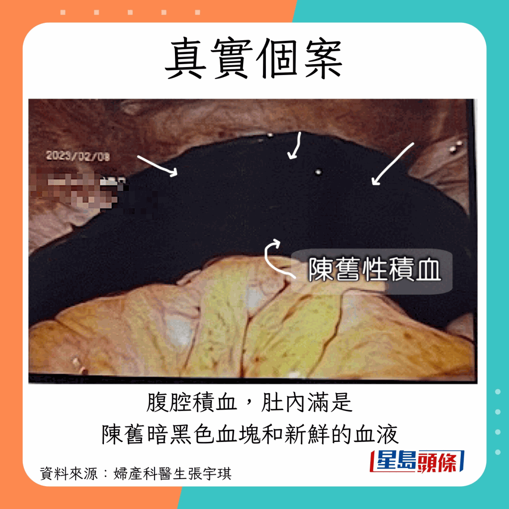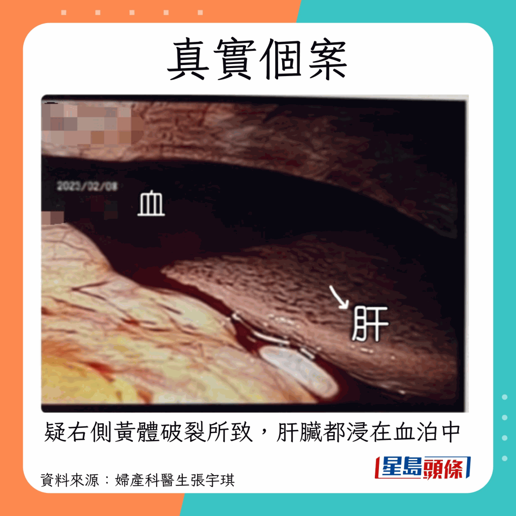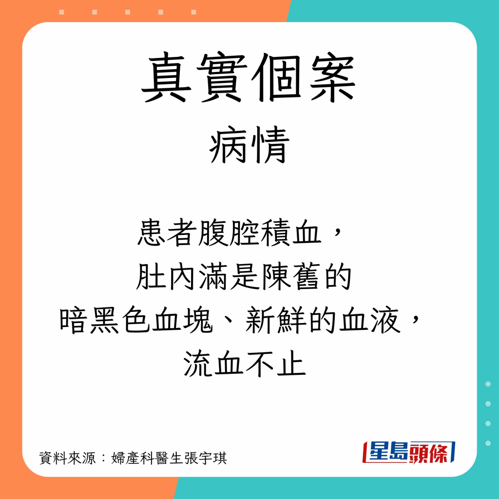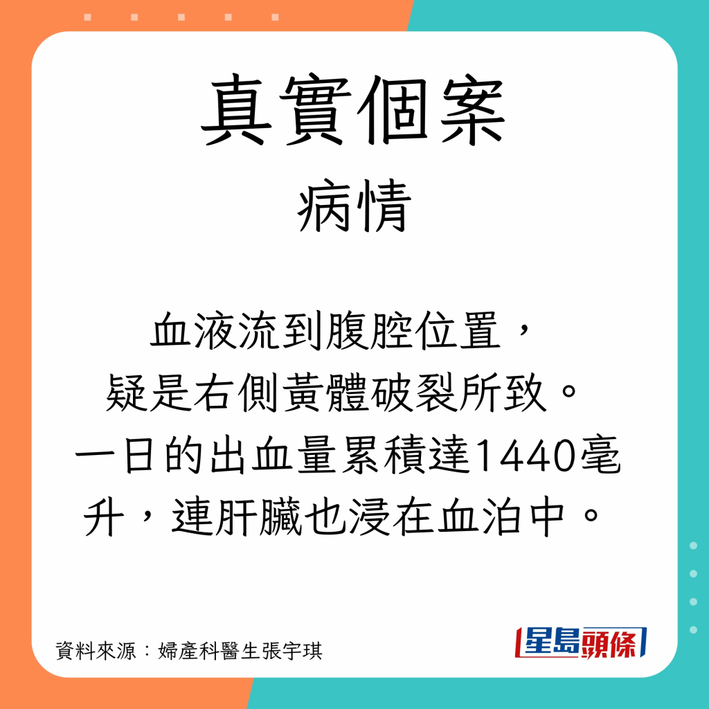 經(jīng)檢查后,張宇琪醫(yī)生發(fā)現(xiàn)該女子腹腔積血,肚內(nèi)滿是陳舊的暗黑色血塊和新鮮的血液,流血不止;血液更流到腹腔位置,并懷疑是右側(cè)黃體破裂所導(dǎo)致。張醫(yī)生更指,該女子一日的出血量累積達(dá)1440毫升,甚至連肝臟都浸在血泊中。