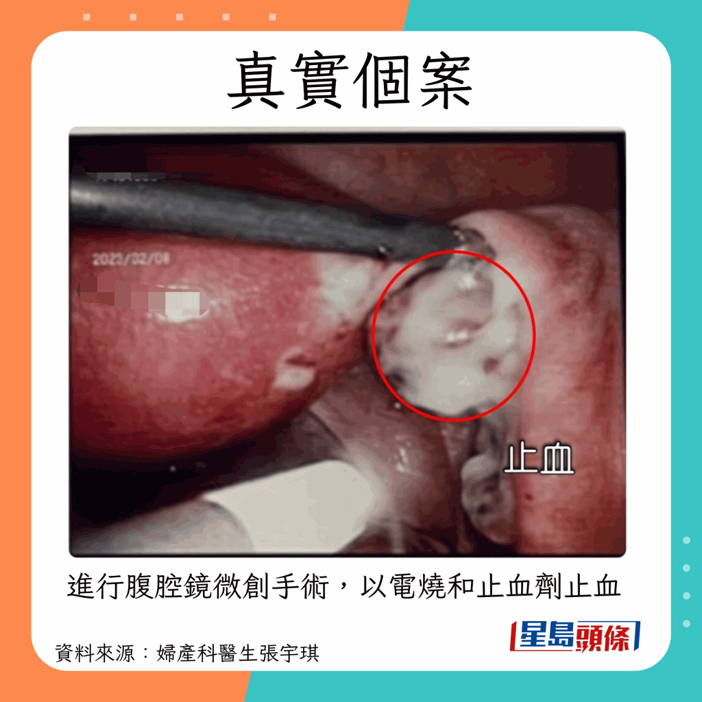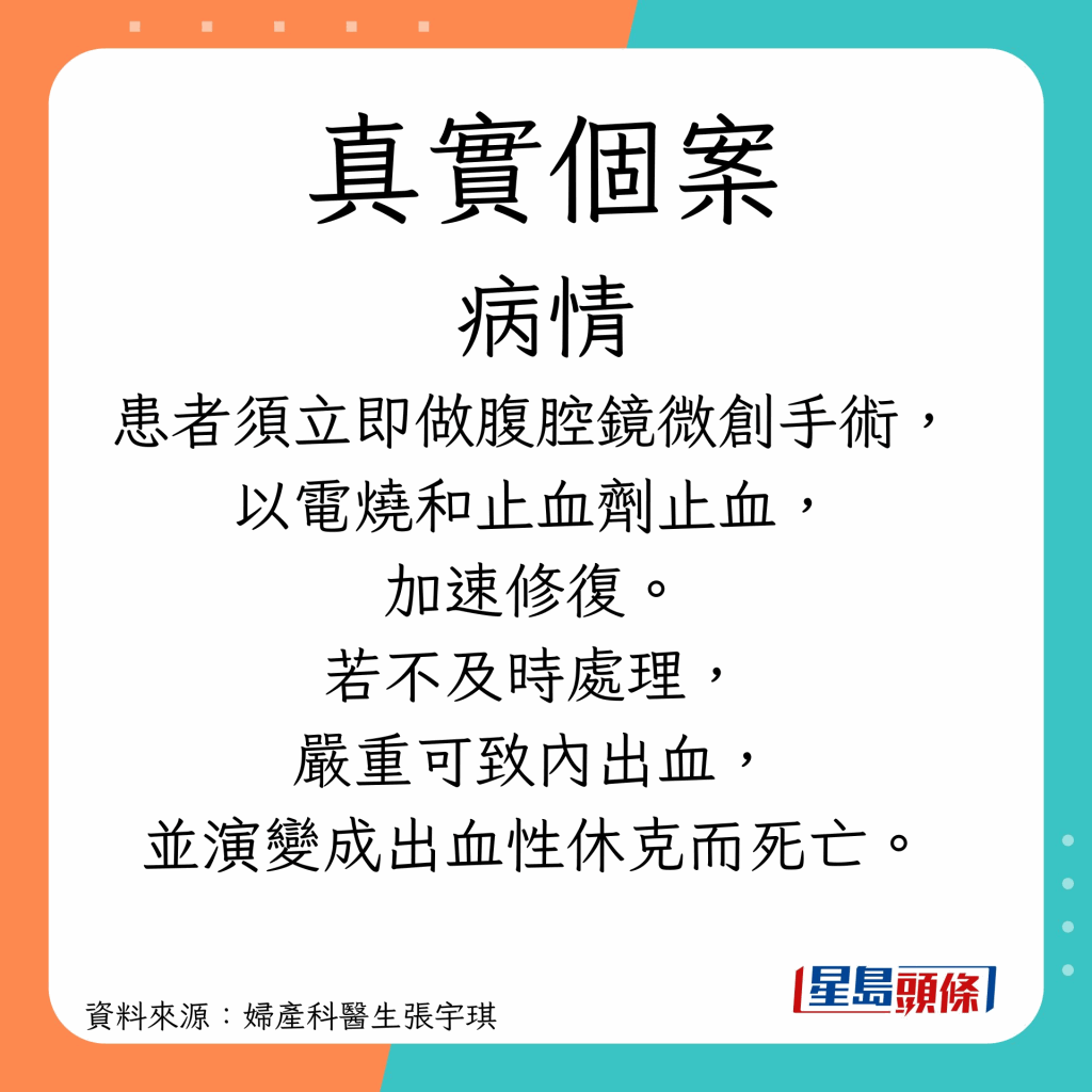 張醫(yī)生立刻為患者安排腹腔鏡微創(chuàng)手術(shù),以電燒和止血?jiǎng)┲寡?,并加速修?fù)。她又指因?yàn)榛颊吣贻p又未曾生育,所以為其恢復(fù)卵巢完整性和避免破壞太多卵巢組織。張醫(yī)生強(qiáng)調(diào),患者由高雄到臺(tái)北才求醫(yī)做手術(shù)的做法過份危險(xiǎn)和輕忽,如果沒有實(shí)時(shí)處理傷勢,最壞情況會(huì)導(dǎo)致內(nèi)出血,并演變成出血性休克而死亡。