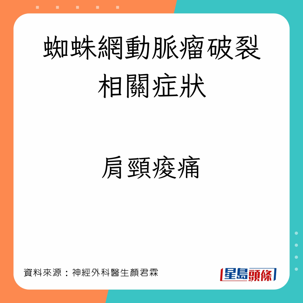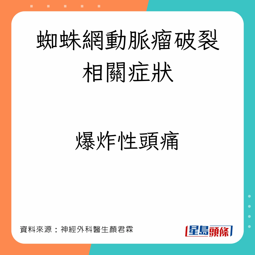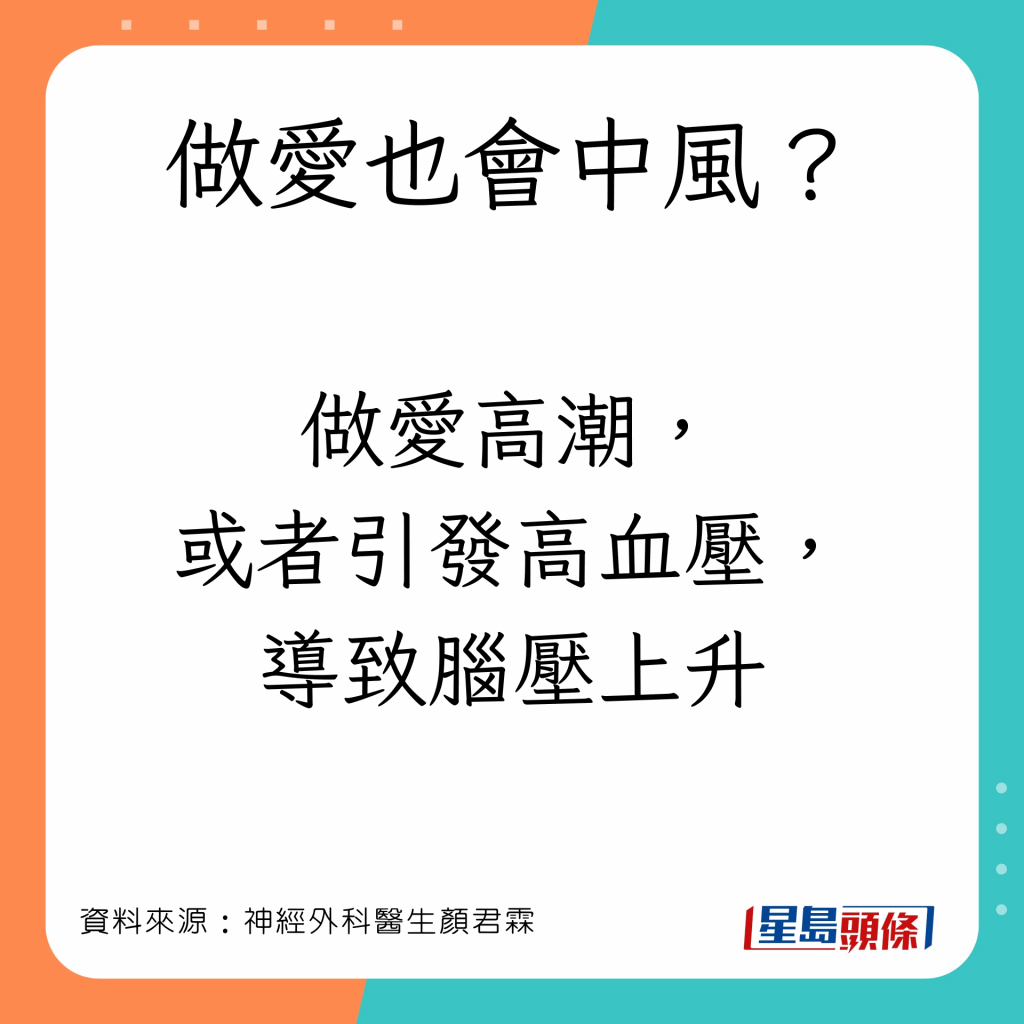 臺(tái)灣神經(jīng)外科醫(yī)生顏君霖曾在節(jié)目《醫(yī)師好辣》中表示,性行為可引致中風(fēng),與一般頭痛不同,若出現(xiàn)以下癥狀,須盡快求醫(yī),以免耽誤黃金治療期: