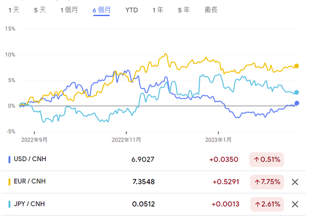▲近六個(gè)月美元(深藍(lán))、歐元(黃)及日元(淺藍(lán))與人民幣兌換率變動一覽。