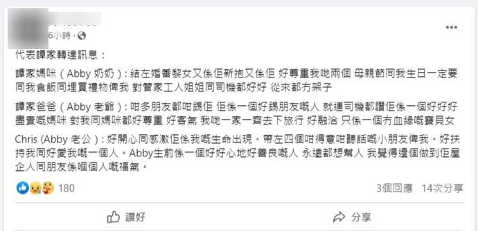 與此同時,蔡天鳳的現(xiàn)任老公Chris亦說:“好開心同感激佢喺我嘅生命出現(xiàn),帶咗四個咁得意咁聽話嘅小朋友俾我。好扶持我同好愛我嘅一個人。Abby生前系一個好好心地好善良嘅人,永遠(yuǎn)都想幫人,我覺得邊個做到佢屋企人同朋友系嗰個人嘅福氣。”