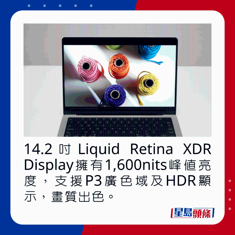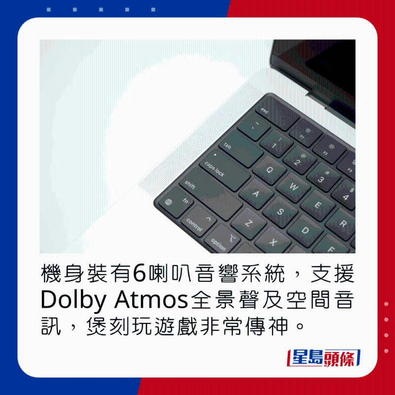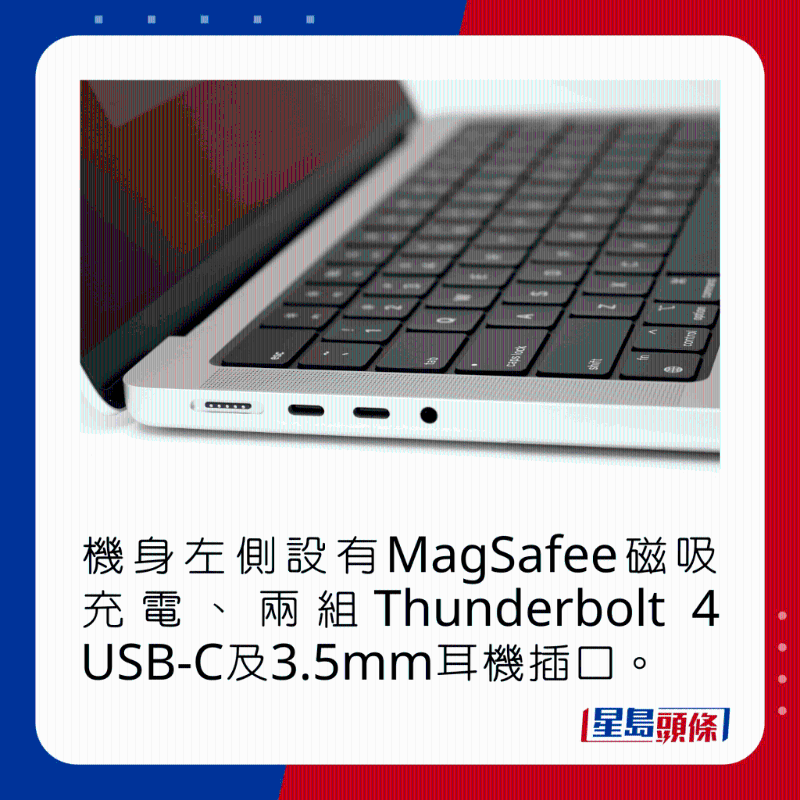 新MacBook Pro 14寸熒幕采用14.2寸Liquid Retina XDR Display(解像度3,024×1,964),具備mini-LED背光技術(shù),擁有1,600nits峰值亮度及1,000,000:1超高對比度,除了120Hz ProMotion自適應(yīng)更新率,亦支持P3廣色域及HDR顯示,畫面亮度充足, 色彩逼真鮮明,無論用于娛樂,又或P照剪片,畫質(zhì)都可用賞心悅目來形容,打機看戲時更可以配合6喇叭音響系統(tǒng),通過Dolby Atmos全景聲及空間音頻加強音效體驗。