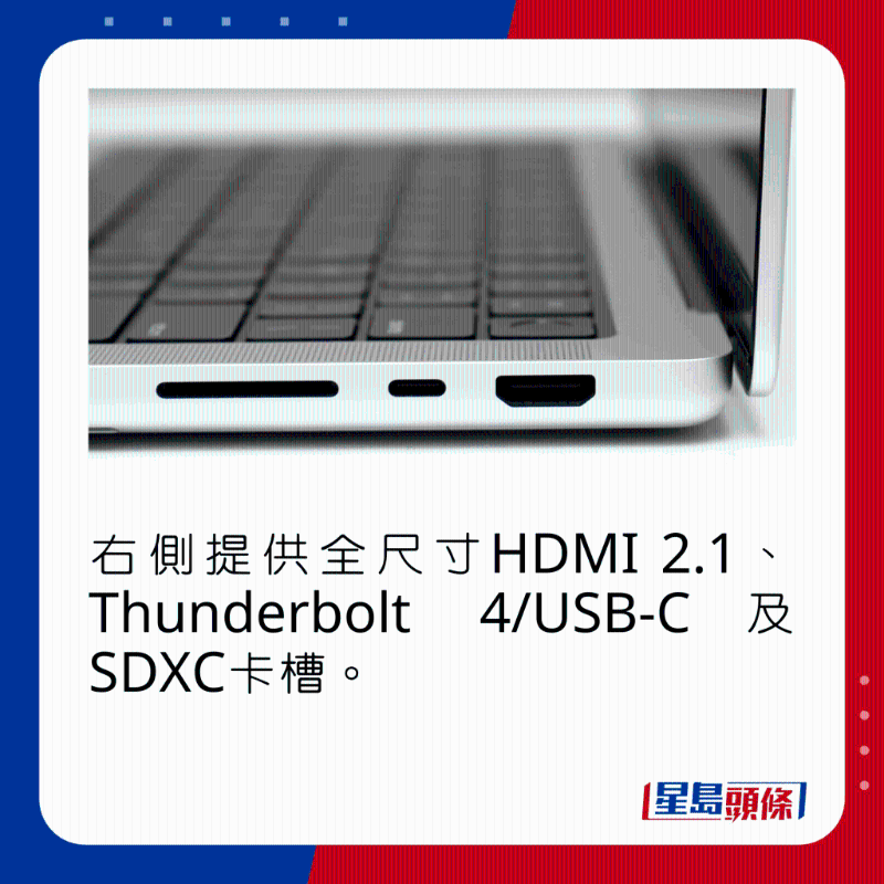 新MacBook Pro 14寸機側(cè)繼續(xù)找到3組兼容Thunderbolt 4的USB-C、MagSafe磁吸充電及全尺寸HDMI插口,還有SDXD卡槽及3.5mm耳機插孔,當中HDMI用上2.1規(guī)格,可以輸出最高8K 60Hz或4K 240Hz影像至外置顯示器。 此外,果粉可通過Thunderbolt 4,以6K 60Hz輸出外接兩部顯示器,若是M2 Max機款,更可同時利用HDMI及3組Thunderbolt 4外接四部顯示器,十分夸張。