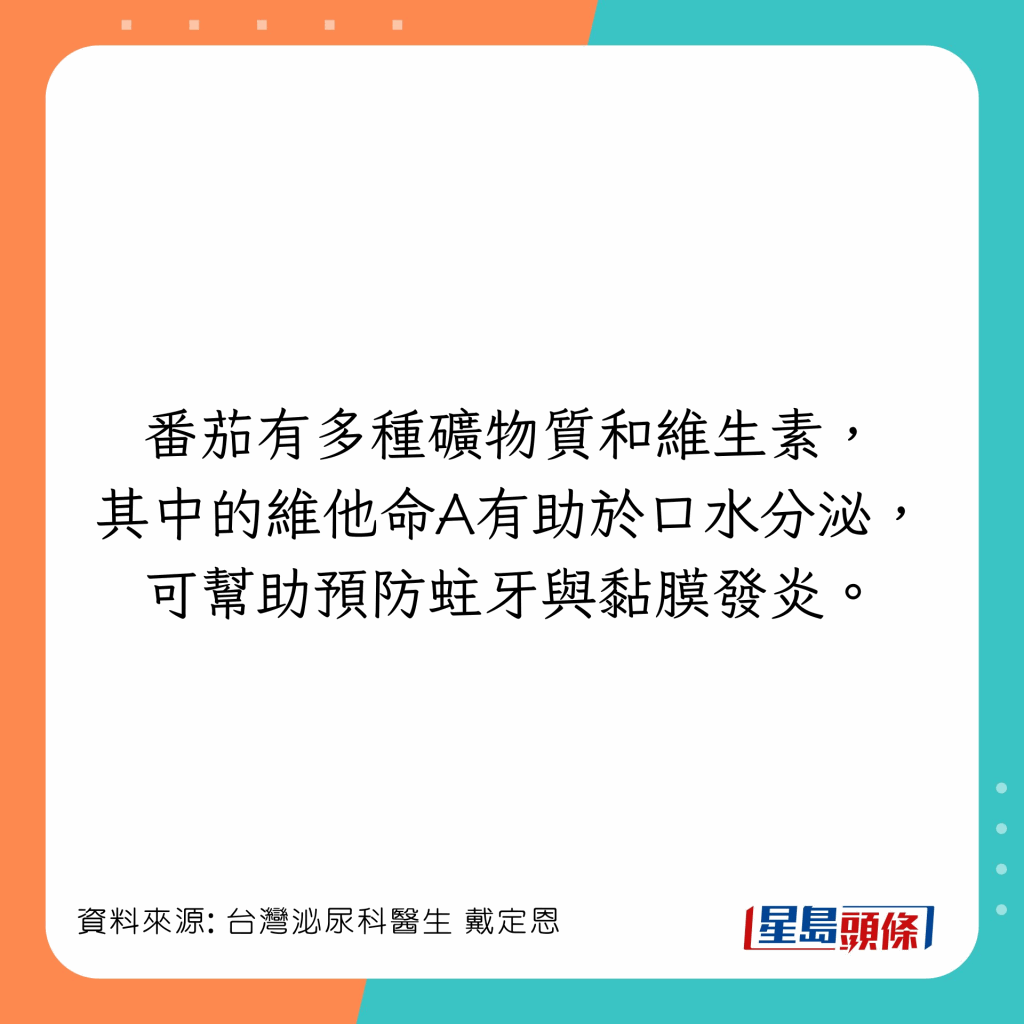 番茄有多種礦物質(zhì)和維生素,其中維他命A有助口水分泌,可預(yù)防蛀牙、黏膜發(fā)炎。