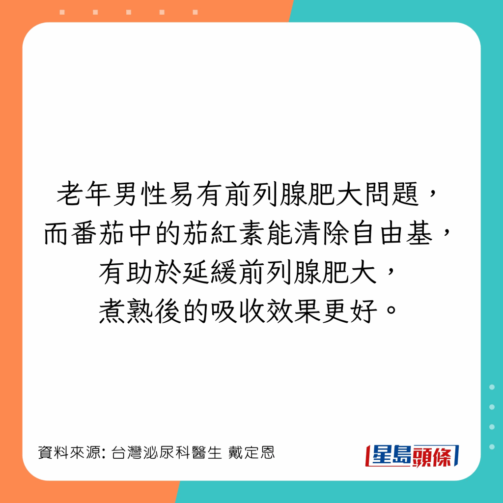 泌尿科醫(yī)生戴定恩在其Facebook專頁發(fā)文指,時(shí)常有患者因前列腺肥大問題向他求醫(yī),他表示要維持前列腺健康,最好就是多攝取茄紅素,最具代表性的食物就是番茄。