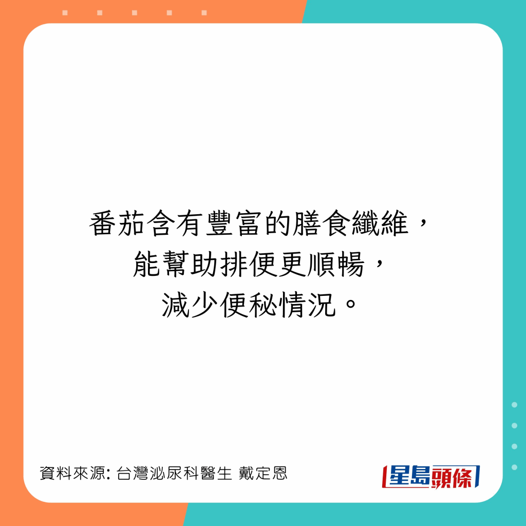 番茄含有豐富的膳食纖維,有助更順暢排便,減少便秘情況。