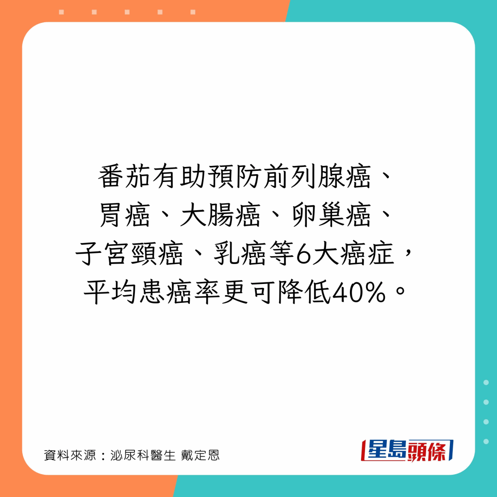戴定恩醫(yī)生指出,番茄有4大好處,除了可以維前列腺健康,更可以預(yù)防6大癌癥,詳情如下: