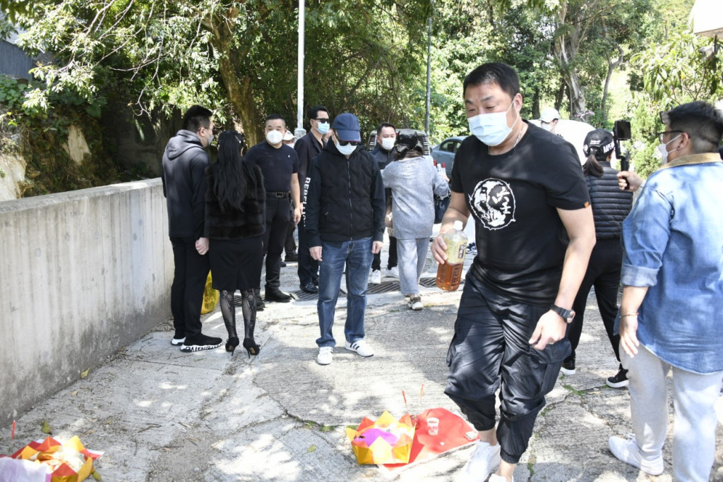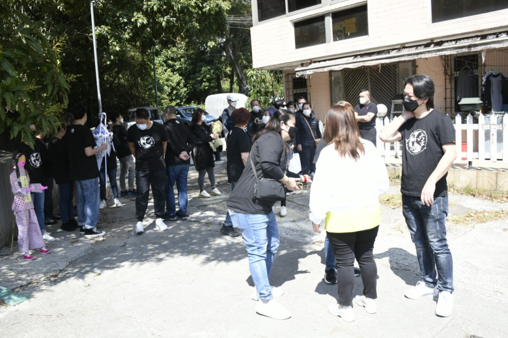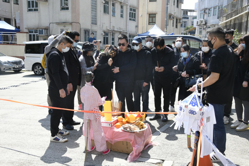 中午時分,現(xiàn)場龍尾村案發(fā)村屋外大批死者的親友到場,他們帶備紙扎公仔及香燭等祭祀用品,進行路祭,今日也是Abby遇害后的頭七。所見路祭以道教儀式進行,有道士在場打齋超渡。Abby母親難掩傷心,伏在女婿Chris的懷中不斷哭泣,Chris也一臉悲痛,默默讓岳母依靠著。