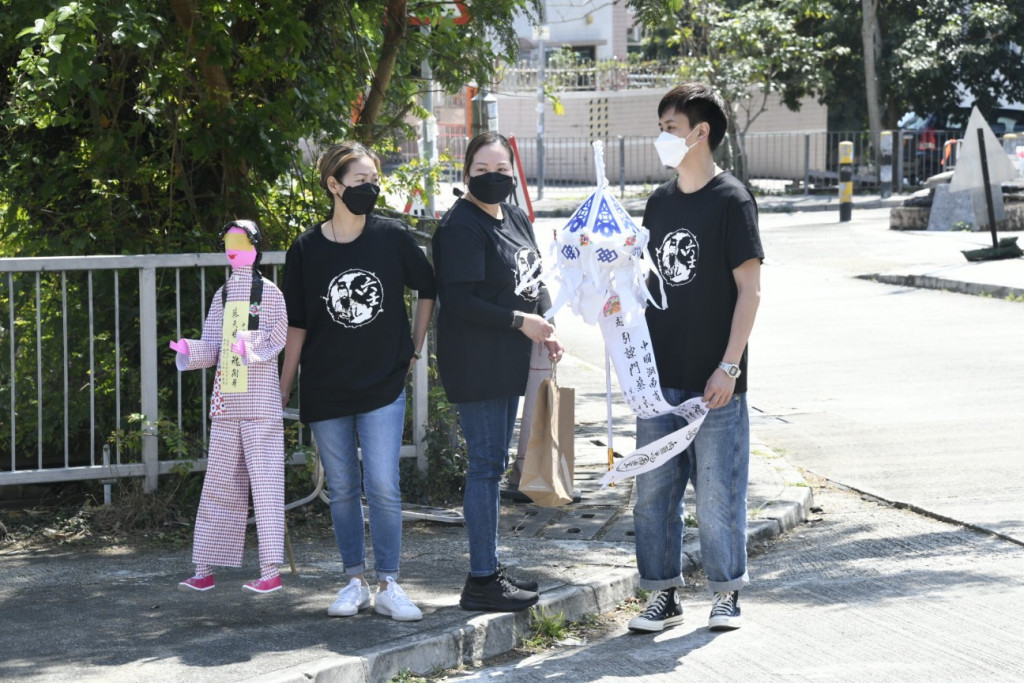 ▲今日是Abby遇害后頭七,Abby父母(左二及左三)與丈夫Chris(右)返回龍尾村路祭。