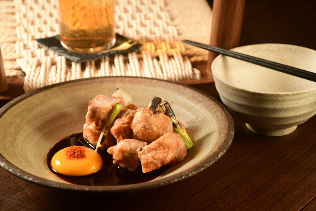 ▲Karaage,雞塊外層是又薄又脆的雞皮,拌勻沾上傳統(tǒng)的月見汁及雞蛋黃吃更香口。
