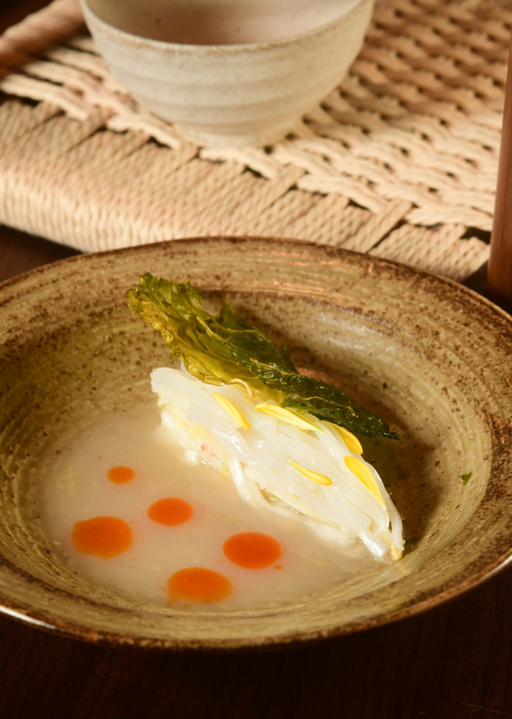 ▲Ika White Kimchi,日本刺身級魷魚切成如面條般的細絲,伴季節(jié)性腌漬蔬果及椰菜薄脆,清爽開胃。
