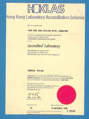 ▲1990年“周生生貴金屬化驗所”取得香港政府工業(yè)署屬下,香港實驗所認可計劃的黃金成色檢定資格,為香港商營機構(gòu)第一家。