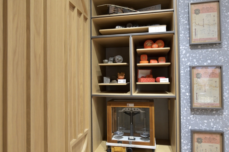 ▲店內(nèi)特設(shè)歷史展品區(qū),擺設(shè)了品牌昔日用來打金的工具,及珠寶單據(jù)等