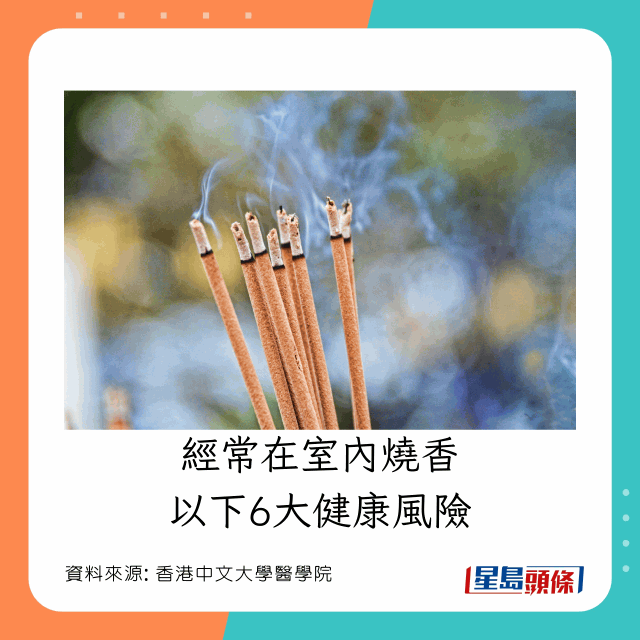 香港中文大學(xué)醫(yī)學(xué)院曾進(jìn)行一項(xiàng)研究指,經(jīng)常在家中燒香,亦可以致癌。因?yàn)闊惝a(chǎn)生的是空氣污染物,經(jīng)常在室內(nèi)燒香并吸入產(chǎn)生的氣體有以下6大風(fēng)險(xiǎn):