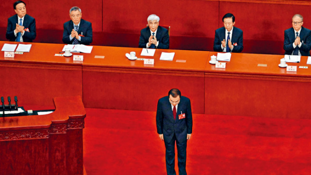 ▲李克強(qiáng)讀畢最后一份政府工作報(bào)告,向臺(tái)下鞠躬。