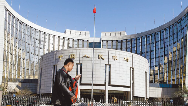 ▲圖為一位正在看手機的年輕人走過北京中國人民銀行總部。(中新社)