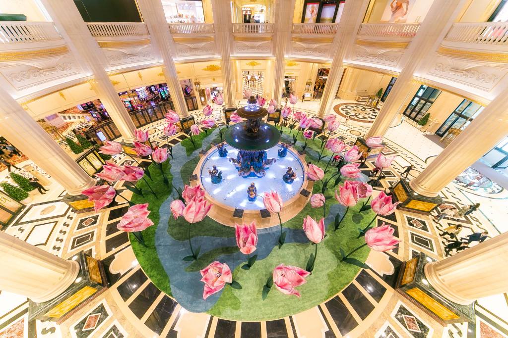 ▲澳門巴黎人大堂的圓形大廳,今個(gè)春天將化身童話般的郁金香花園,約五十朵高五米的巨型郁金香矗立在海神噴泉周圍。