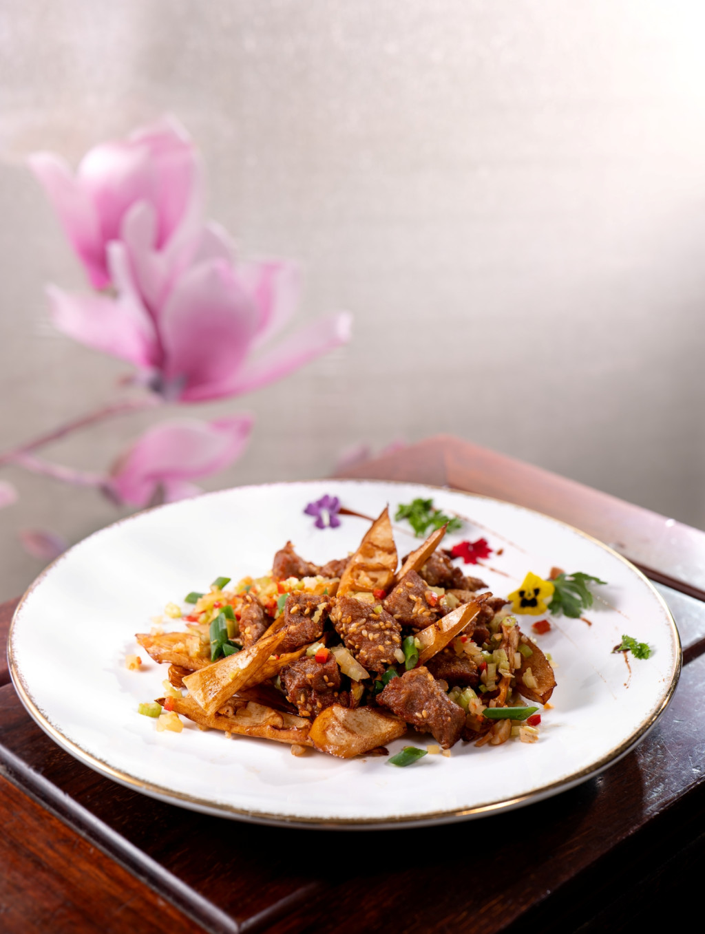 不時不食,東來順以春天當(dāng)造、味道清鮮的春筍炮制滋味菜式。例如春筍鮑魚燜鴨($528),香濃鴨肉配清爽的春筍,以惹味醬汁提鮮。黃湯春筍鹿筋($688)是春天滋補(bǔ)湯水,營養(yǎng)豐富的鹿筋具有滋補(bǔ)健身、強(qiáng)筋骨等功效,與春天時令食材春筍一起燉湯,味道香甜。餐廳以招牌涮羊肉作招徠,主廚施超群師傅更為春天菜單加入干煸春筍羊里脊($398),羊肉香濃軟腍。另有東來順蜀香辣醬爆春筍牛肉($348)、雪菜春筍河蝦仁($328),前者惹味香辣,后者清爽。