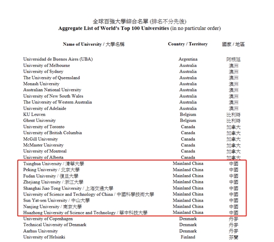 B、C兩類中的全球百強(qiáng)大學(xué)中,內(nèi)地滿足該條件的高校有9所——清華大學(xué)、北京大學(xué)、復(fù)旦大學(xué)、浙江大學(xué)、上海交通大學(xué)、中國科學(xué)技術(shù)大學(xué)、中山大學(xué)、南京大學(xué),以及華中科技大學(xué)。