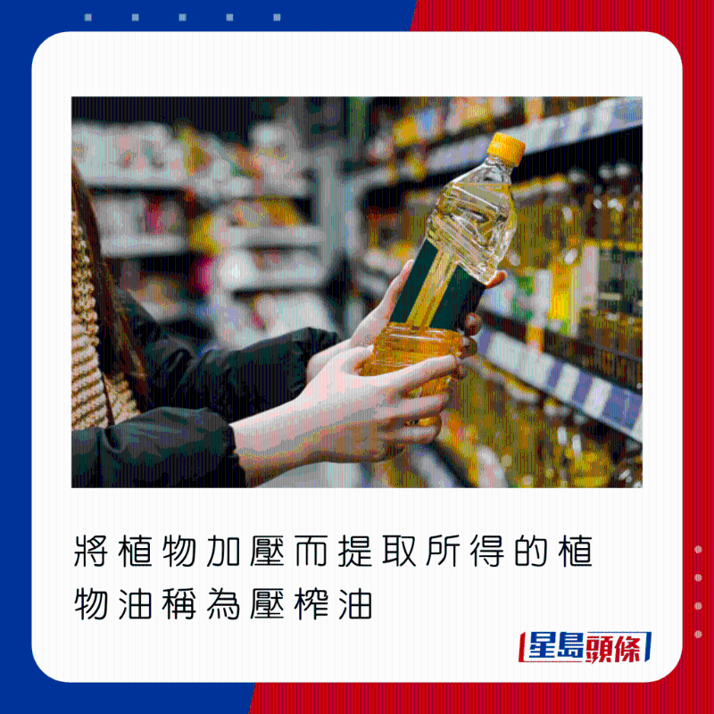 - 將植物加壓而提取所得的植物油稱(chēng)為「壓榨油」,當(dāng)中又分為「冷壓油」和「熱壓油」。