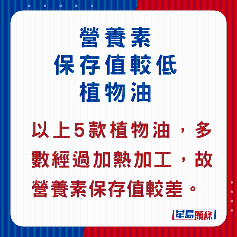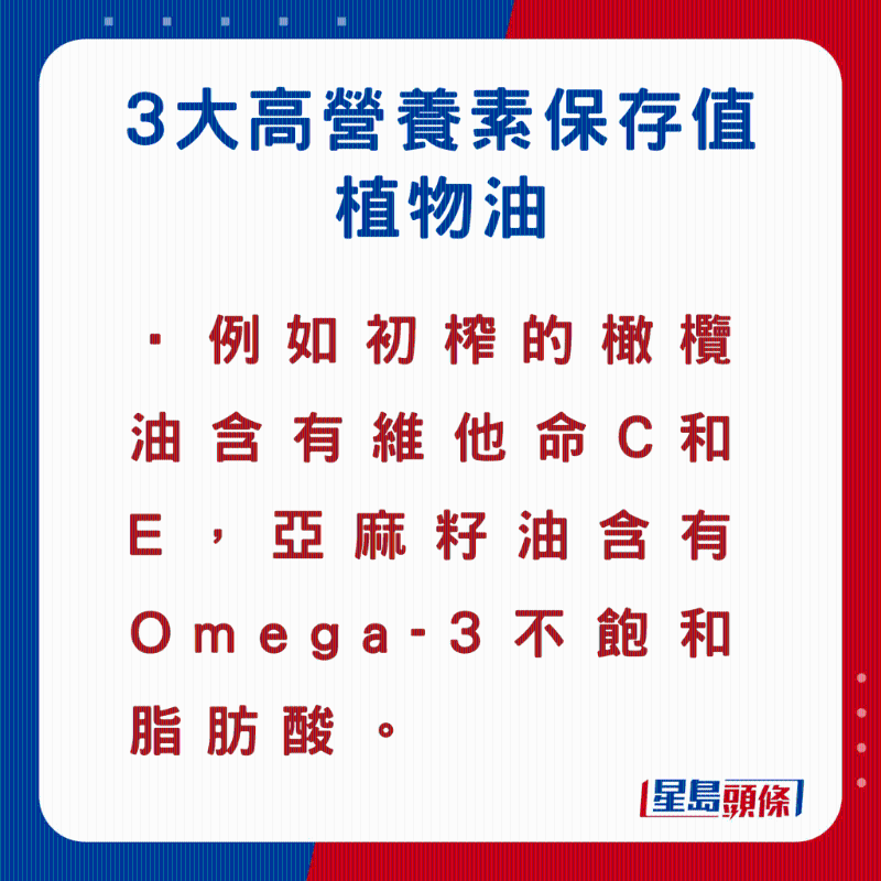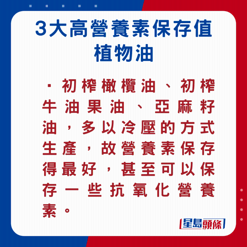 營(yíng)養(yǎng)師溫巧晴,提供以下指引,當(dāng)中包括3款高營(yíng)之選,以及哪些屬于營(yíng)養(yǎng)素保存得較差的植物油: