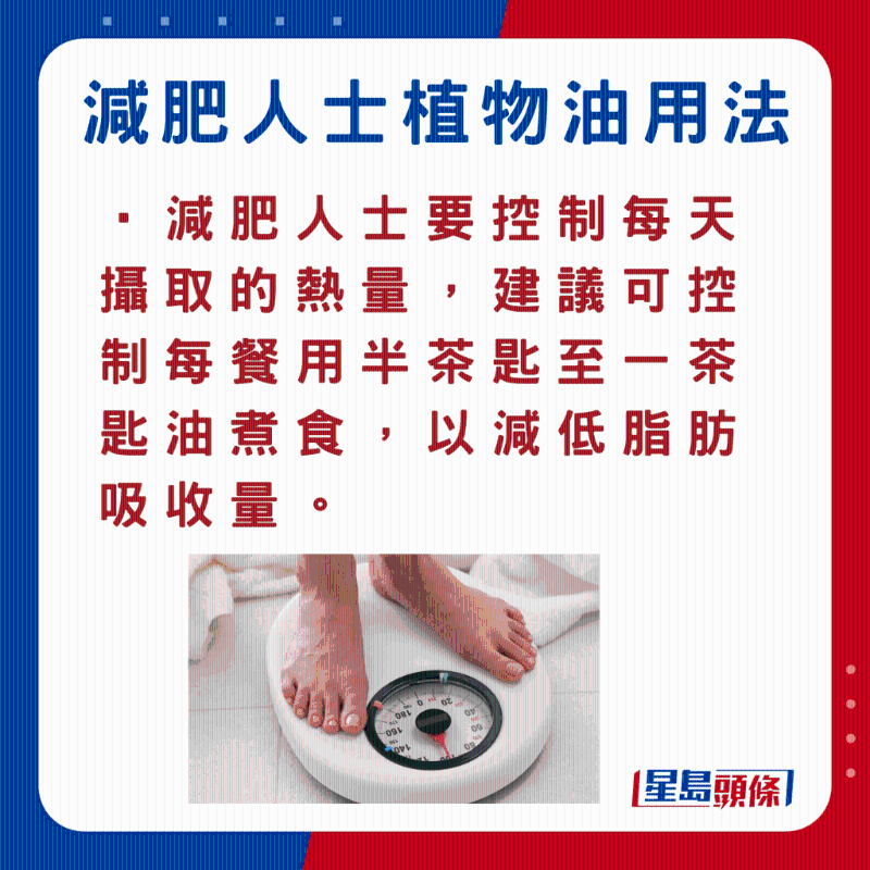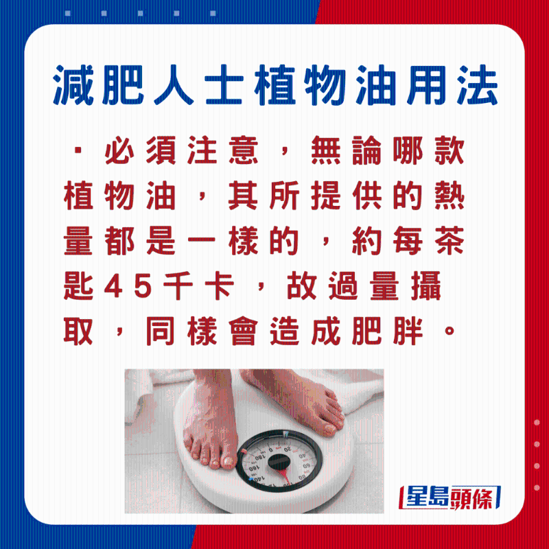 有需要嚴(yán)格控制體重的人士,建議參考營(yíng)養(yǎng)師溫巧晴的植物油健康智用方法: