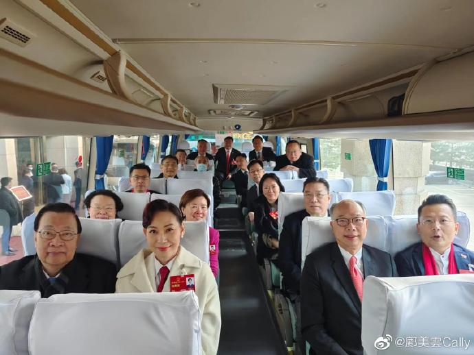 ▲鄺美云與其他與會者一起乘車到會場。微博