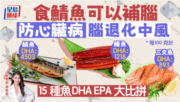 高敏敏表示,想大腦更靈活,可以進食魚類以攝取足夠的DHA和EPA。 不過,各種魚類營養(yǎng)含量也不同,她列出15種魚類的DHA和EPA含量作比較。