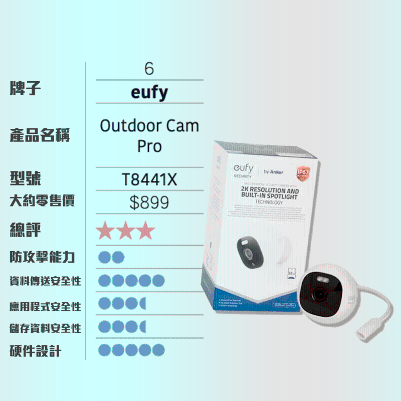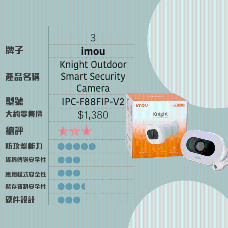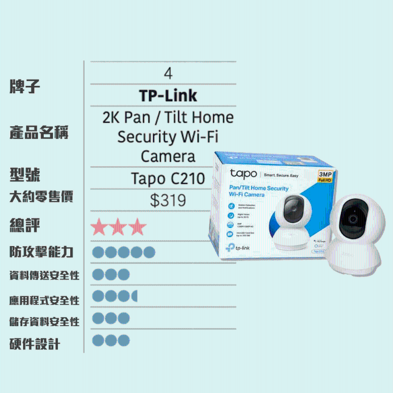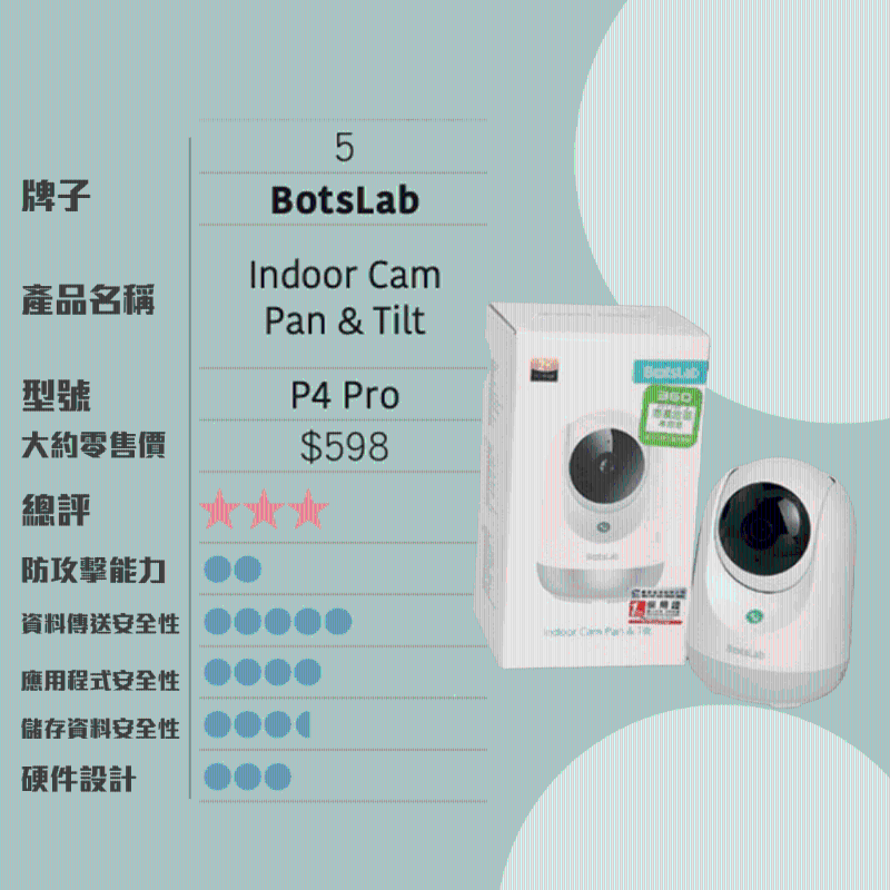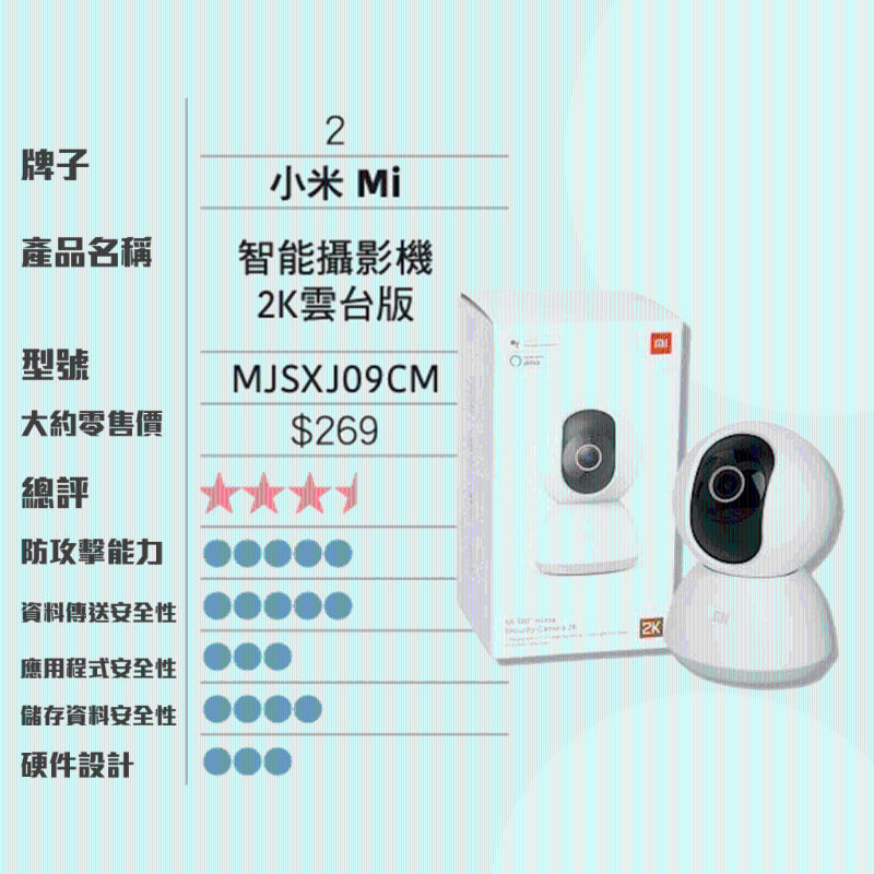 此外報告指出,小米“智能攝影機2K云臺版”MJSXJ09CM鏡頭,零售價約為$269,是10款中最便宜,但獲得的總評卻是第二高,防攻擊能力、資料傳送安全性亦是各款中最佳。