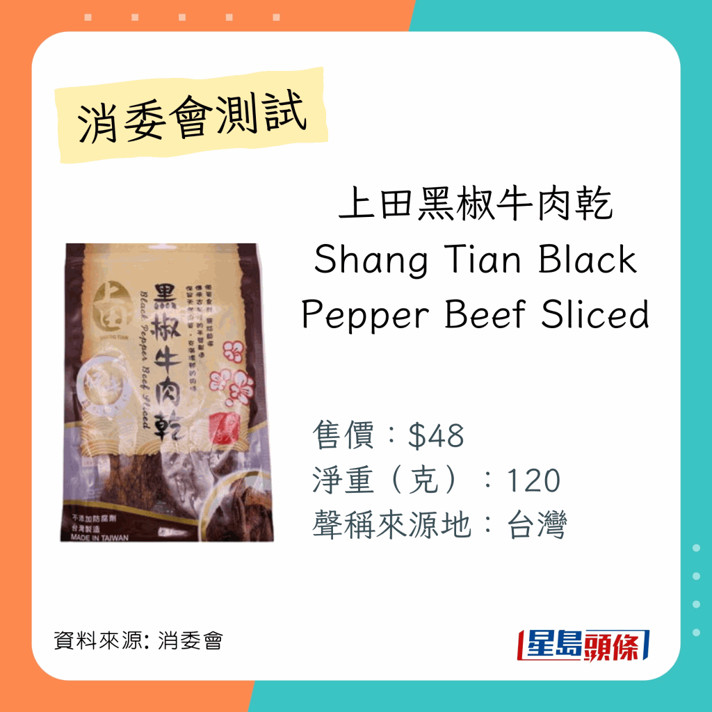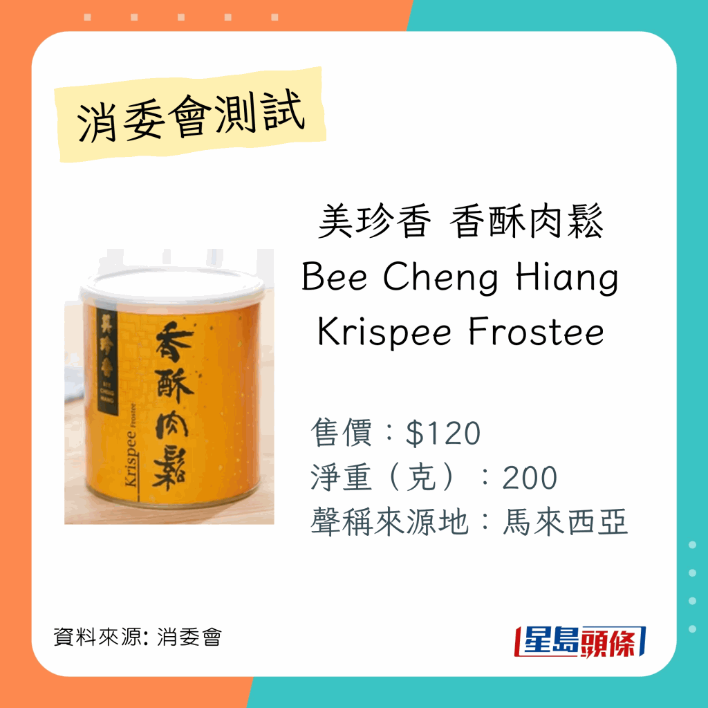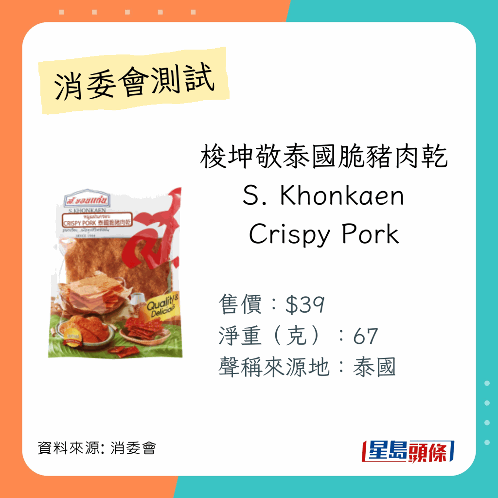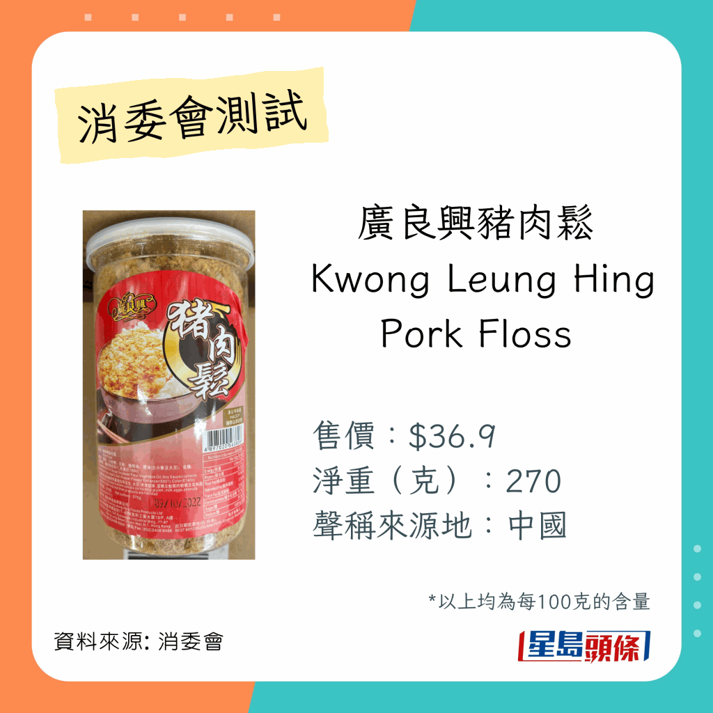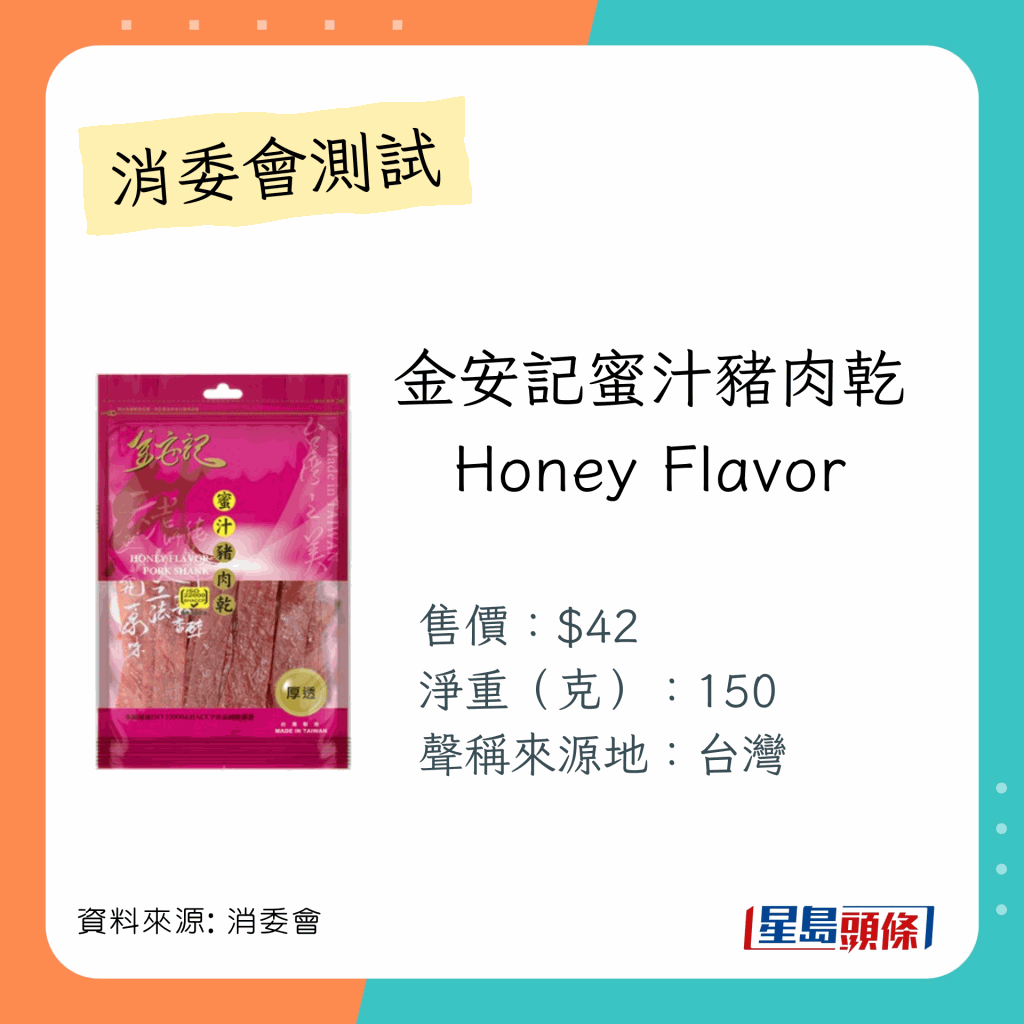 消委會于2022年10月至11月,在主要零售點搜集了10款豬肉干、8款牛肉干、8款豬肉松和4款豬肉紙(脆豬肉干)樣本,每包售價介乎$11.5至$170不等,而每100克的售價則由$13.7至$96.8。