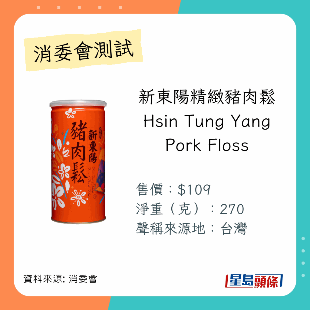 消委會測試發(fā)現(xiàn),30肉干、肉松和肉紙樣本中,有9款總評達4.5分并沒被檢出污染物或致癌物,為高分之選。品牌、產(chǎn)品名稱、產(chǎn)地及價格如下: