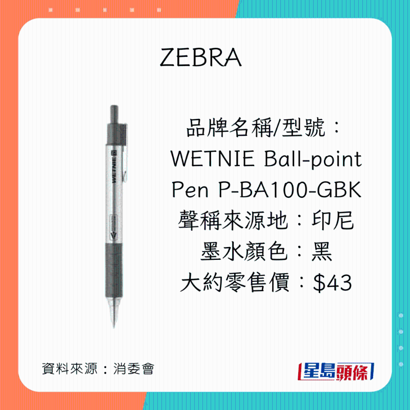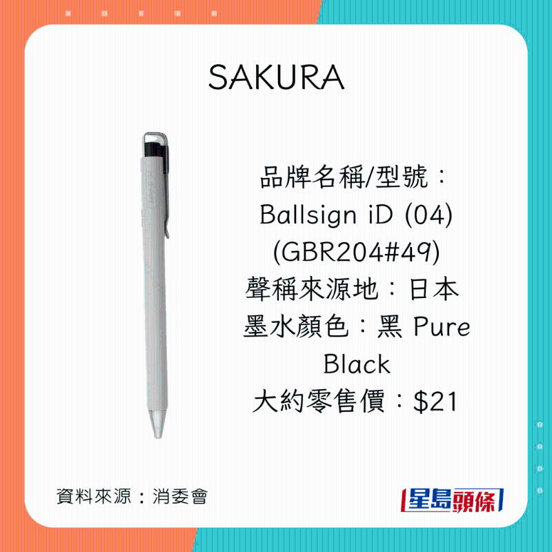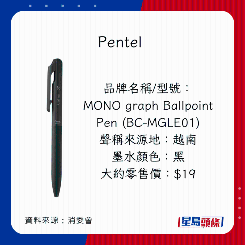 消委會(huì)早前調(diào)查市面上40款,價(jià)格由$2.4至$86不等的原子筆啫喱筆,包括18款原子筆(ballpoint pens,又稱油墨圓珠筆),以及22款啫喱筆(gel ink pens,又稱中性墨水圓珠筆)。墨水顏色方面,22款為黑色;15款為藍(lán)色;以及3款為藍(lán)黑色。35款屬按壓式型號(hào);余下5款則為揭蓋式型號(hào)。