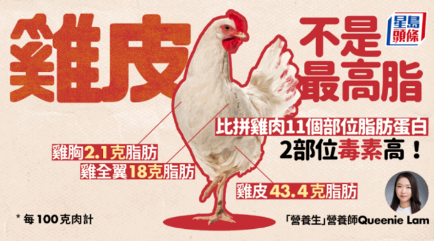 雞皮竟然不是雞肉最高脂部位?“營養(yǎng)生”(Negimen)營養(yǎng)師Queenie Lam指出,雖然雞肉蛋白質(zhì)豐富,但并非所有部位均含豐富營養(yǎng),反而甚至易致肥、有激素毒素。她指出,雞11個部位中,有5大高脂部位,但最高脂不是雞皮;另有2個部位易藏毒素,不宜食用;但亦有4個部位最低脂、蛋白質(zhì)高。